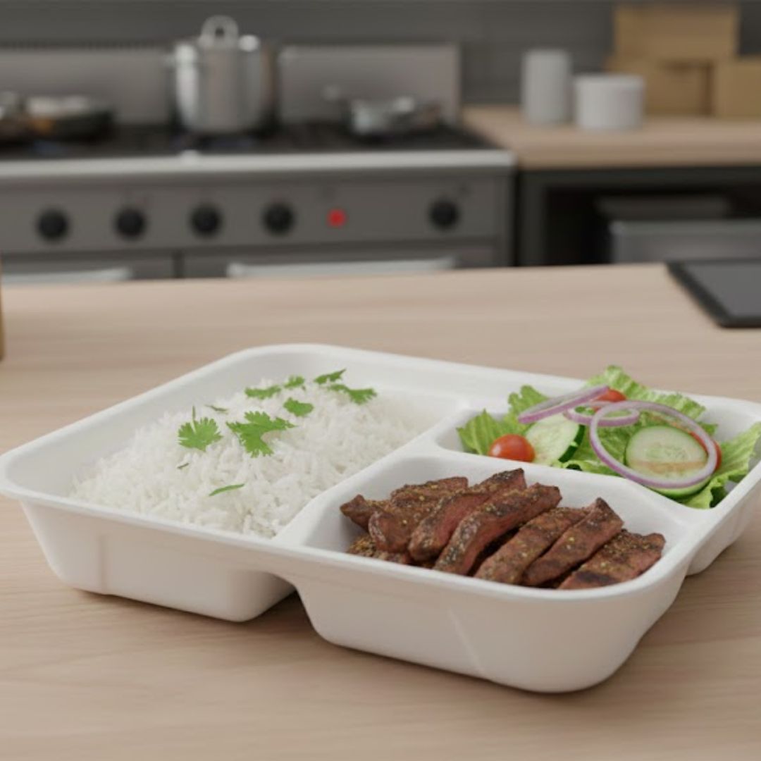 Embalagem em isopor Fibraform HF90/3, com 3 divisórias e capacidade total de 650 ml, ideal para separar e transportar refeições com praticidade e segurança. Leve e resistente, é indicada para uso em delivery, eventos e refeições comerciais.