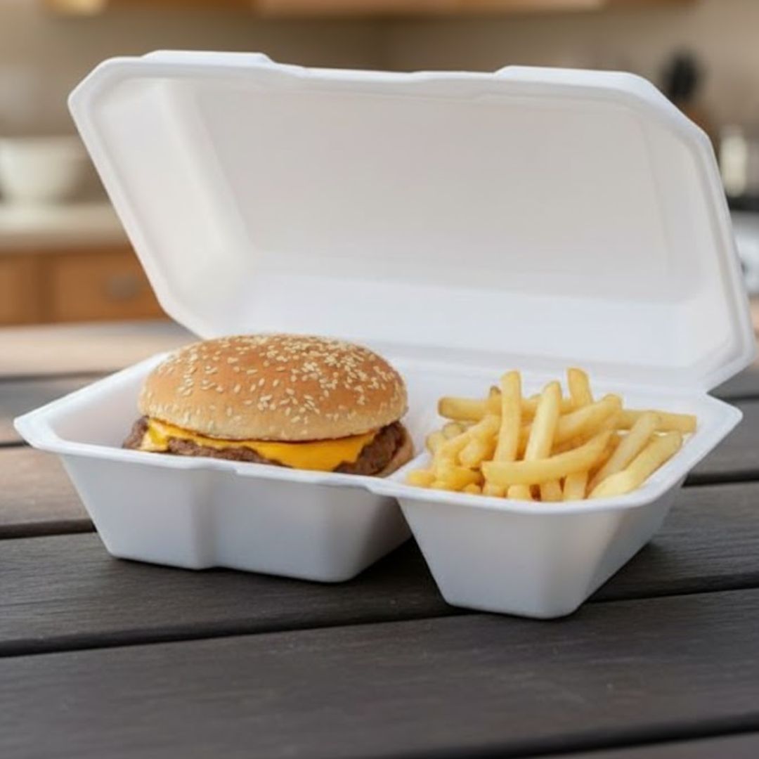 Ideal para delivery, a embalagem FIBRAFORM HF121 é feita em isopor resistente e possui tampa acoplada, garantindo praticidade e conservação térmica.
