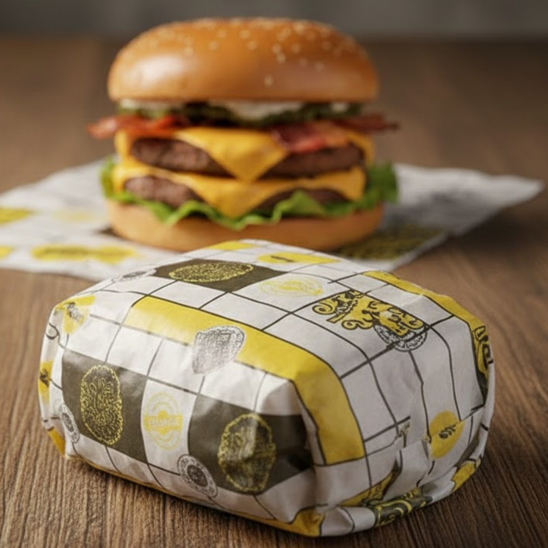 Papel acoplado com película protetora, da linha Buguer Black da marca Pluma, ideal para embalar hambúrgueres, lanches e alimentos diversos.
