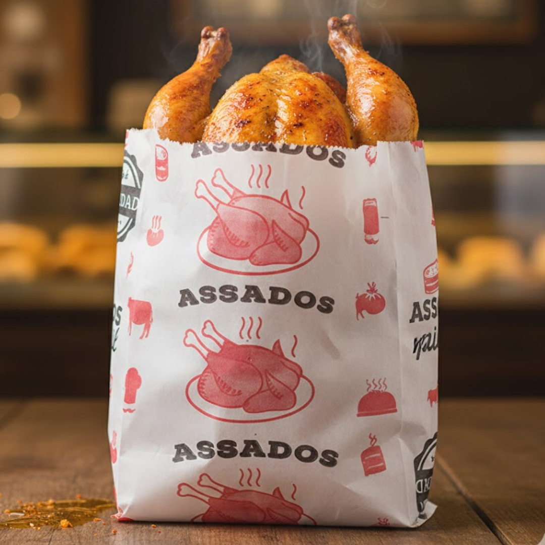 Saco produzido em papel especial com barreira contra gordura, ideal para acondicionar frangos assados e alimentos gordurosos.
