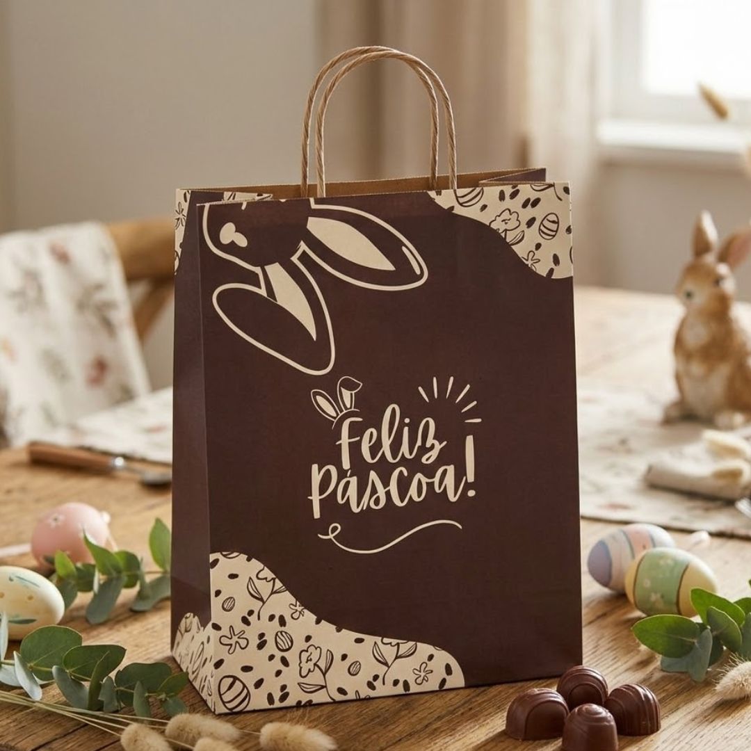 Encante seus clientes nesta Páscoa com as sacolas de papel. Perfeitas para presentear com charme e elegância, com estampa exclusiva.